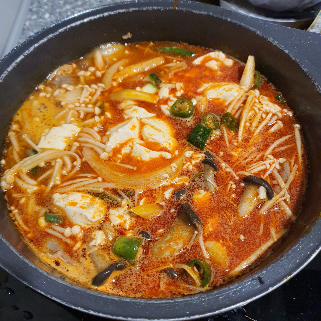 모듬채소, 팽이버섯, 느타리버섯을 넣고 2분 정도 끓인 후 순두부를 넣습니다.
